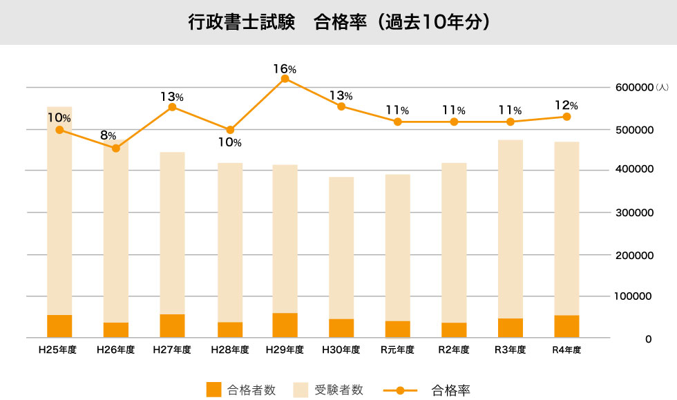 行政書士試験の合格率は、例年10〜15%を推移しています。